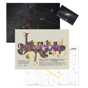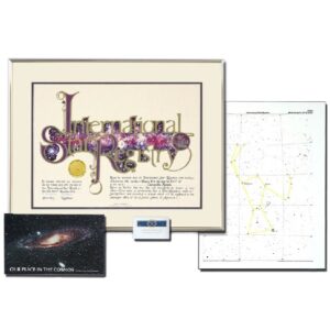 - Includes a personalized 12″ X 16″ star chart customized with the star name and dedication date. The location of the star is circled in red.